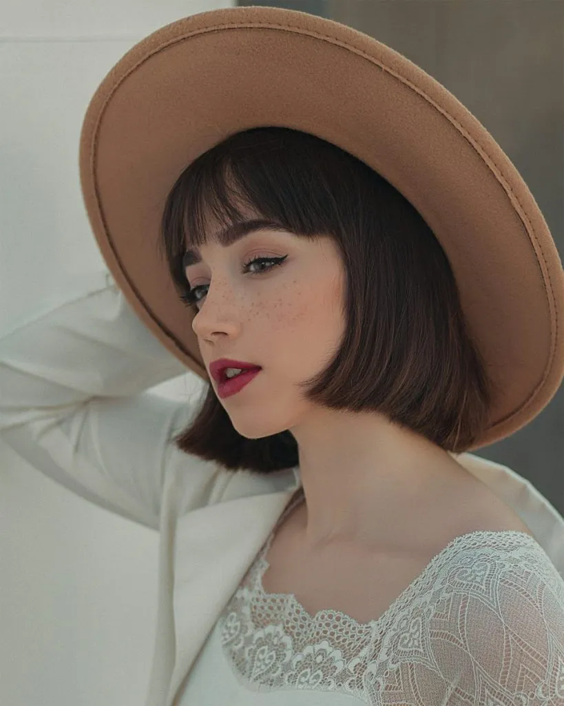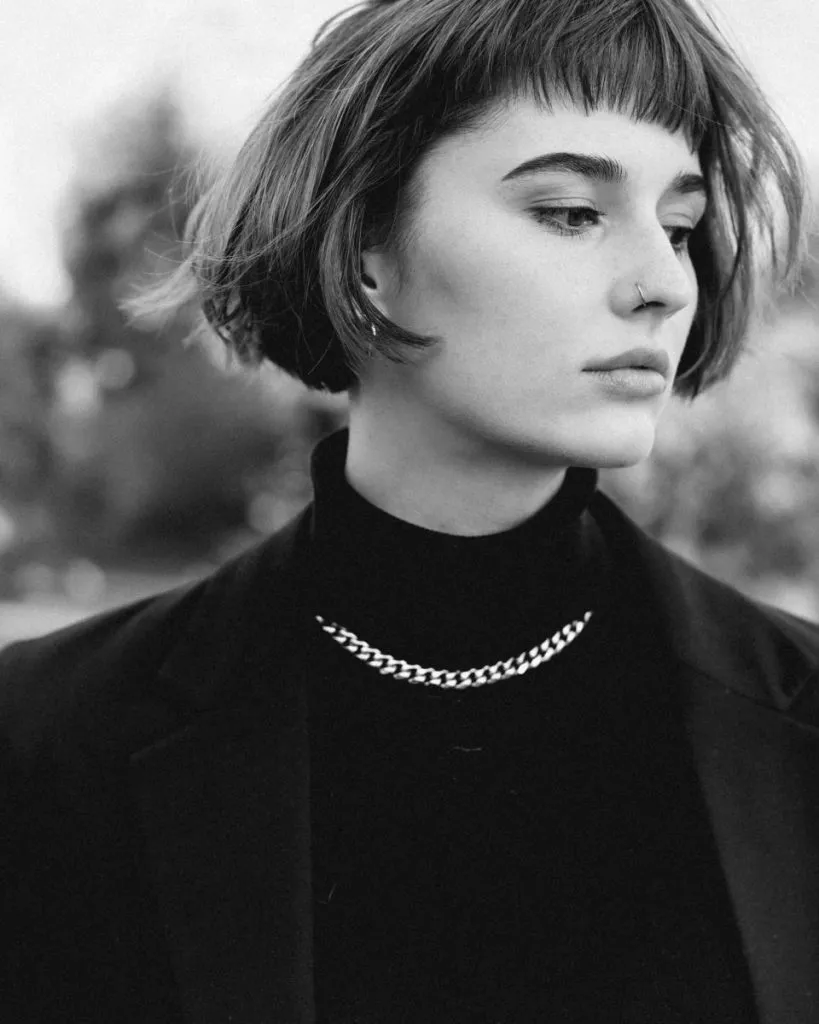 Simple and sophisticated, this chin-length bob is such a timeless classic. The sleek lines and blunt cut make a real impact — super clean, super chic, very “quiet luxury aesthetic.” And honestly, the full bangs are everything here. They add that soft, rich-girl vibe while still keeping the whole look modern and polished. It’s minimal, elegant, and gives off that low-key expensive energy without trying too hard.